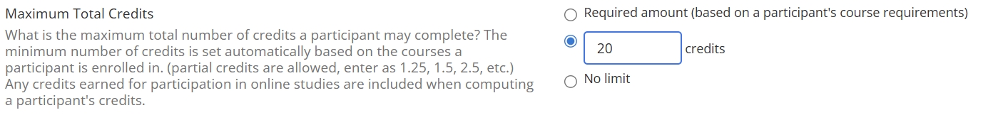 This means participants can take part in online studies even if they have already met their online credit limit, but only after they have already met their course credit requirements. Also, if your site has a maximum for the total number of credits participants can earn, then participants will not be able to exceed this total (by “total” we mean credits from both online and lab studies).